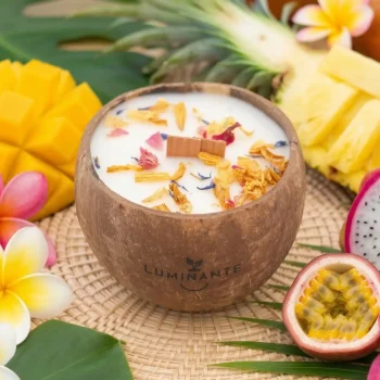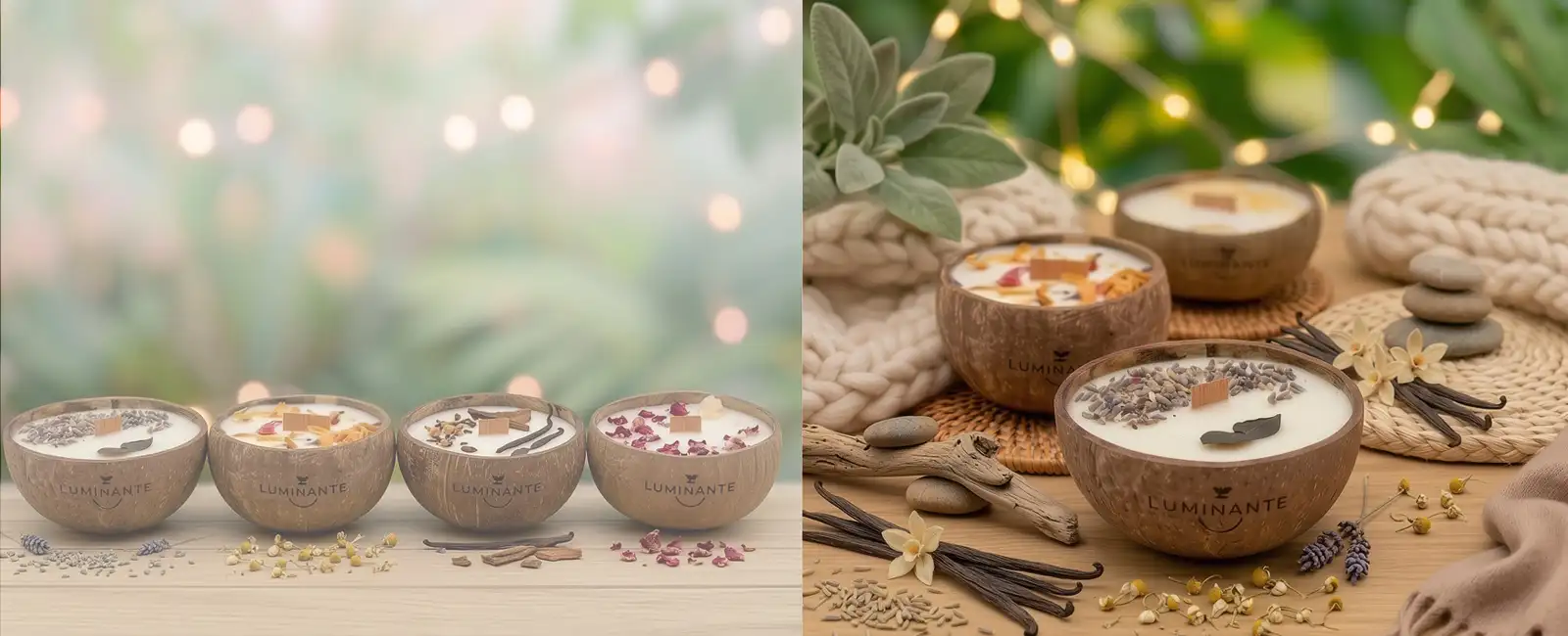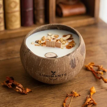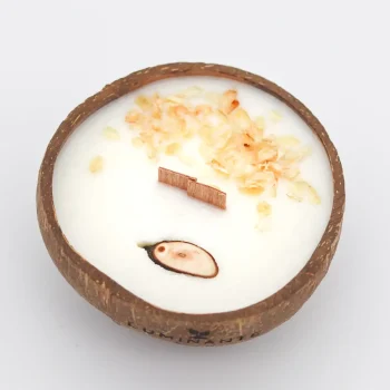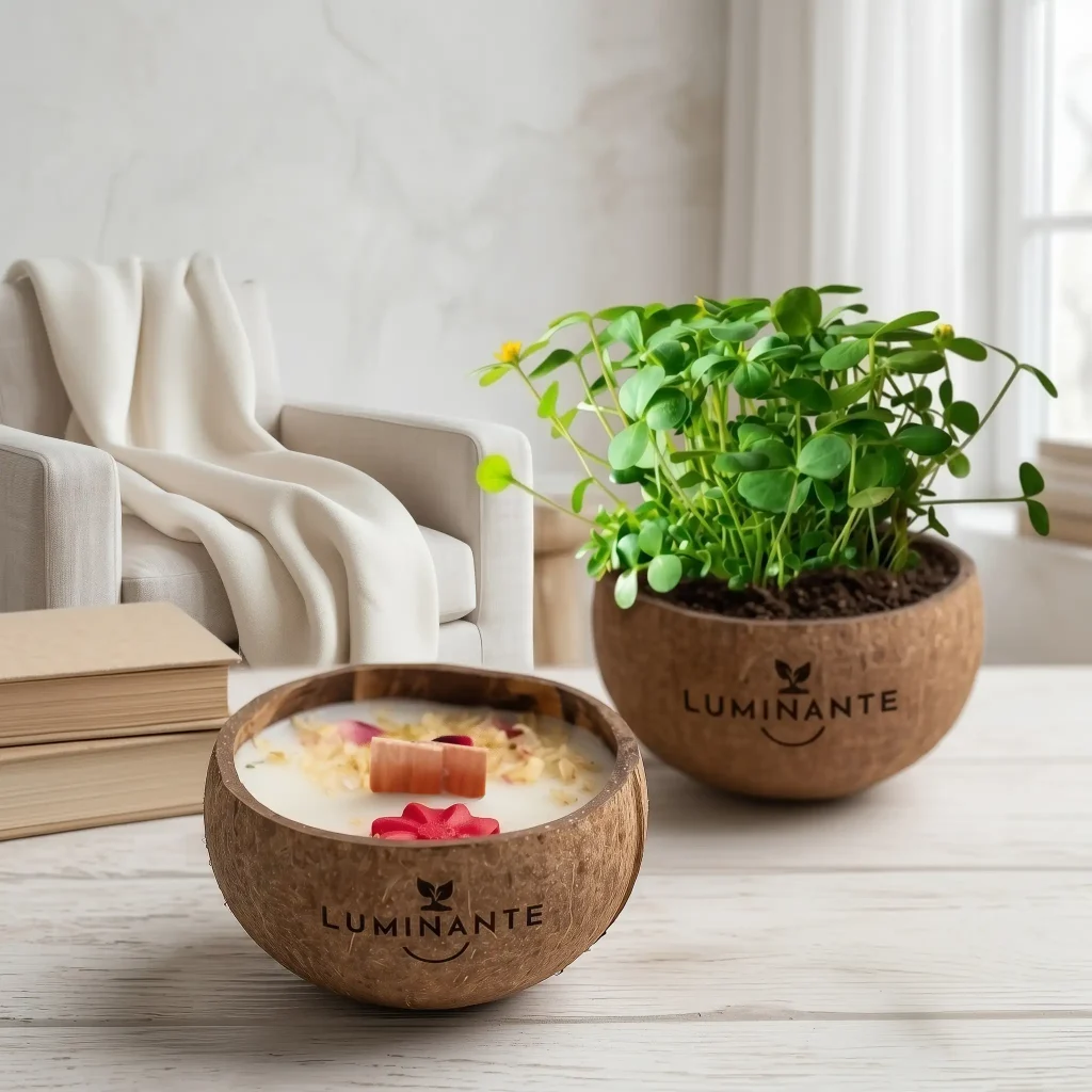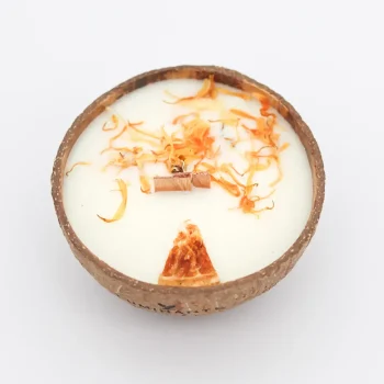 Ce processus écologique permet de donner une seconde vie à chaque bougie, transformant un objet de bien-être en un geste pour la nature. Nos contenants, comme les demi noix de coco, sont choisis pour leur beauté naturelle et leur durabilité.