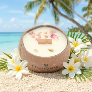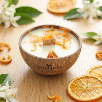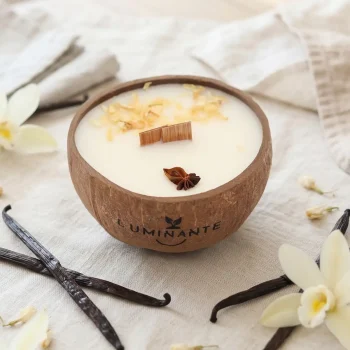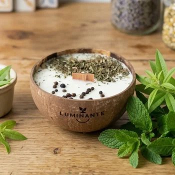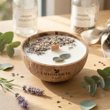 Chez Luminante, nous utilisons uniquement des ingrédients bio pour nos bougies. La cire végétale de soja, les parfums naturels de Grasse et les mèches en bois garantissent une combustion propre et sans toxines.