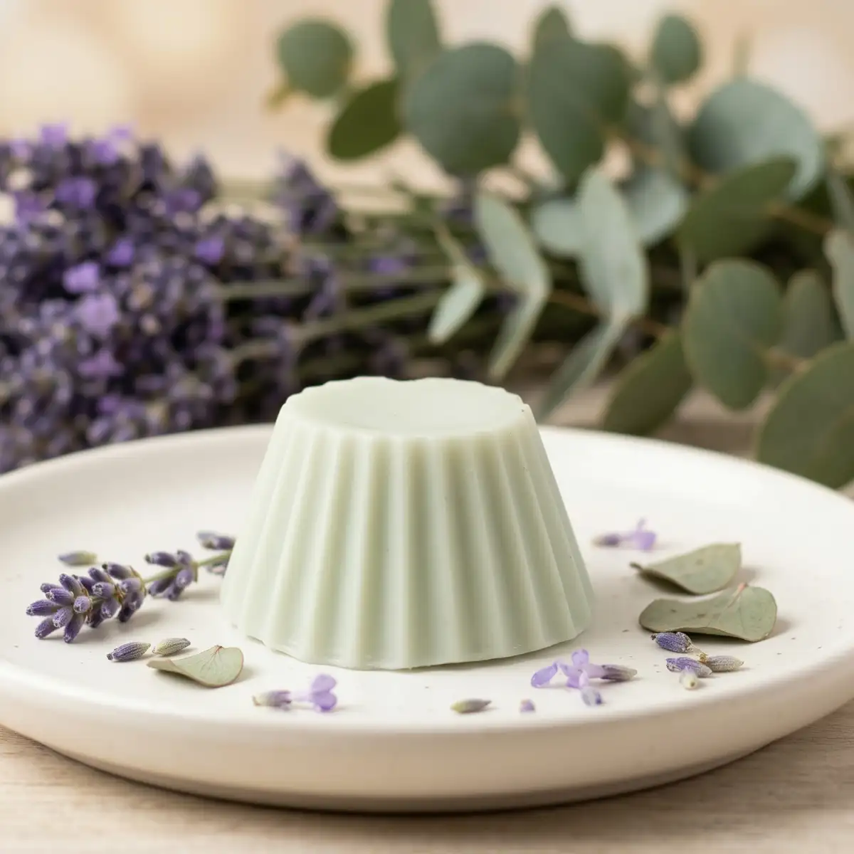 Fondant parfumé à l’Eucalyptus Lavande. Cire végétale de soja, 100% naturelle. Fabrication artisanale Française, coulé à la main.